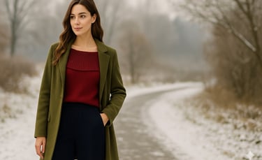 Como Usar (Dica Lumére): O Casaco Boreal Verde é o exemplo perfeito. O tom verde azeitona é sofisticado e, quando combinado com o cinto na cintura, cria uma silhueta dramática. Use-o fechado (como um vestido) com as Calças Velo Pretas por baixo e adicione a Mala Viena Preta para um look executivo impecável.